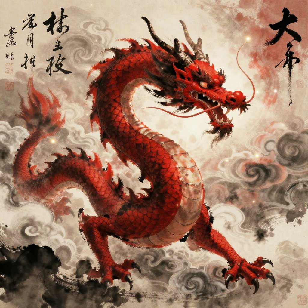 Red Asian dragon depicted in a traditional brushstroke style, twisting through clouds with rich reds and deep shadows, ancient calligraphy elements integrated, mythical ambiance with an ethereal glow, balanced composition evoking strength and elegance.