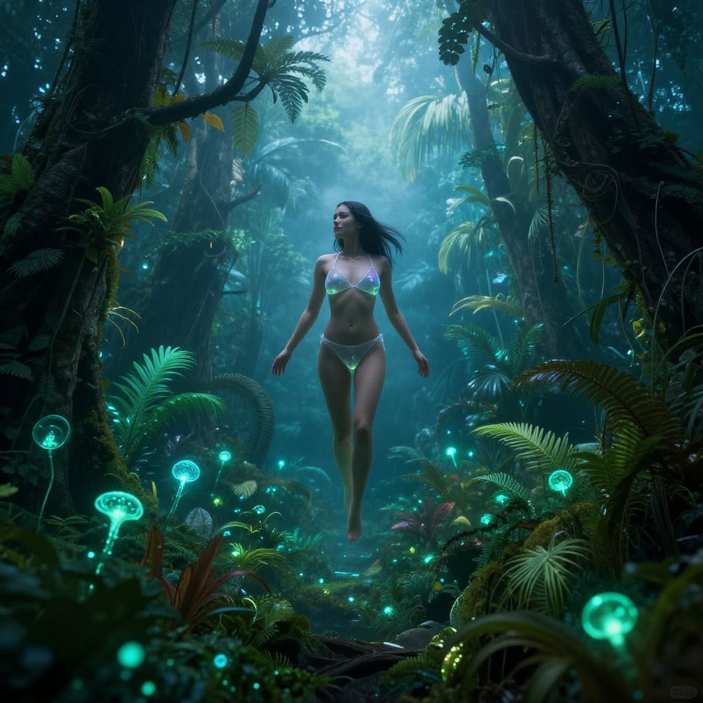 Girls in bright short dresses running through a rainforest trail, green canopy, moss-covered stones, dramatic shadows, dynamic movement, vibrant jungle colors, cinematic lighting, high-resolution realism, adventure theme