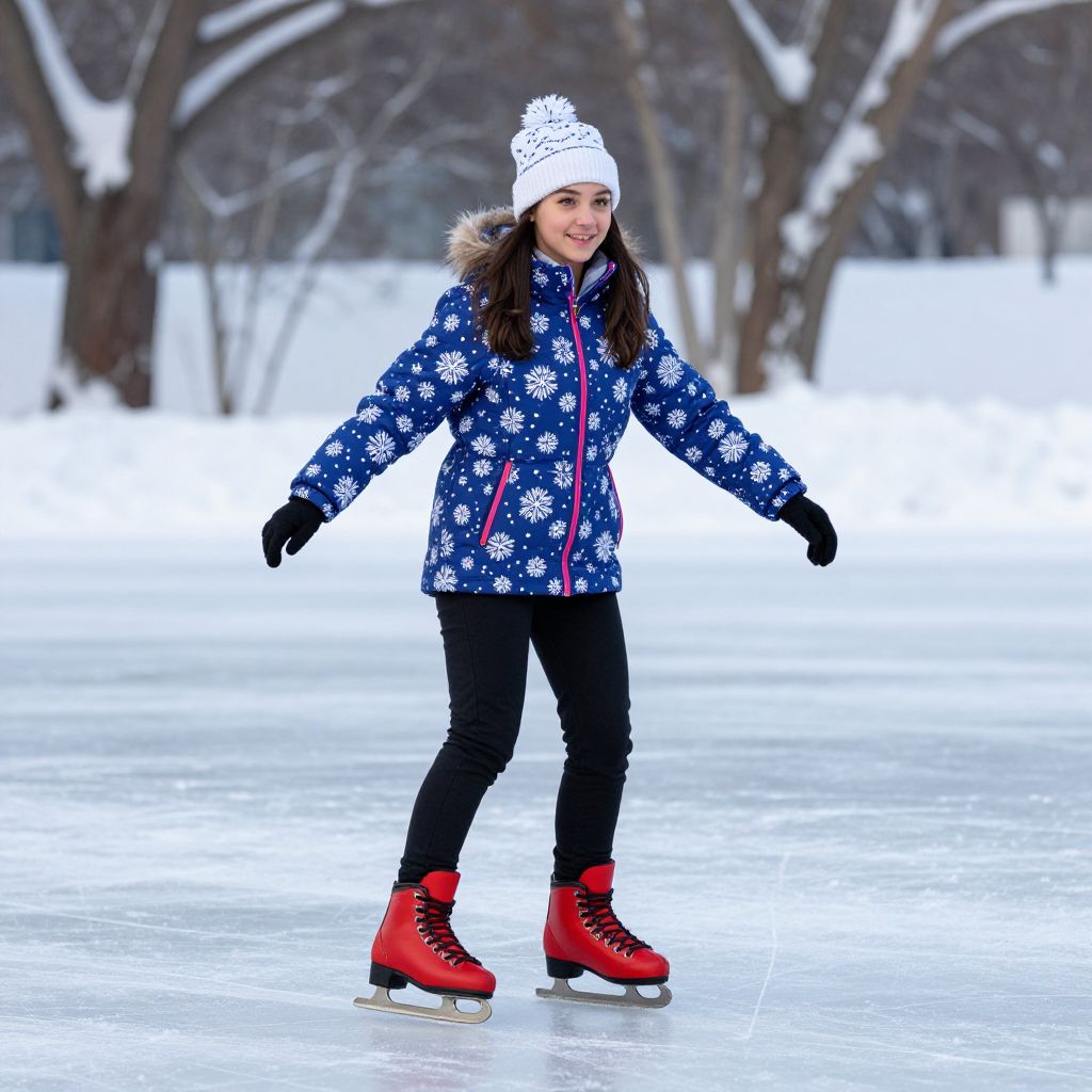 A young woman with expressive brown eyes and a warm smile skates on a winter morning in a vibrant winter skating outfit featuring red boots, a snowflake-patterned jacket, and a matching cap, standing on a frozen pond with snow-covered trees in the background, realistic photography style. The woman has big tits and cute face