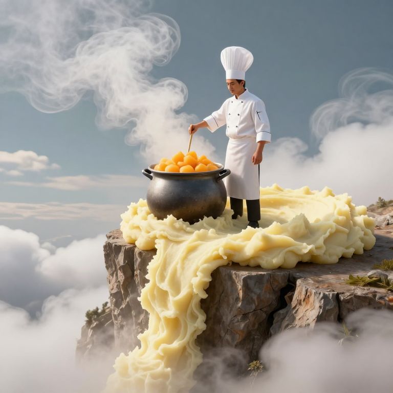 A solitary chef in pristine whites stands atop a cascading cliff of fluffy mashed potatoes, stirring a colossal pot brimming with golden-orange ingredients, as the steam billows into the sky like ethereal clouds of flavor.