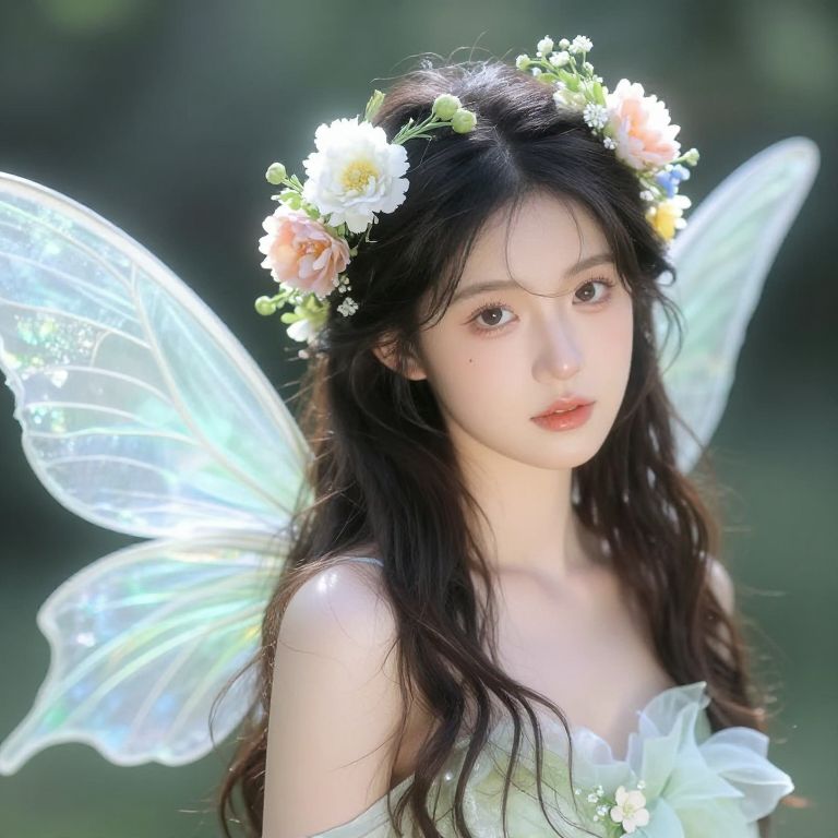 Photograph of a fair-skinned, young Asian woman with long dark hair, wearing a floral crown, glowing white fairy wings, and a green dress