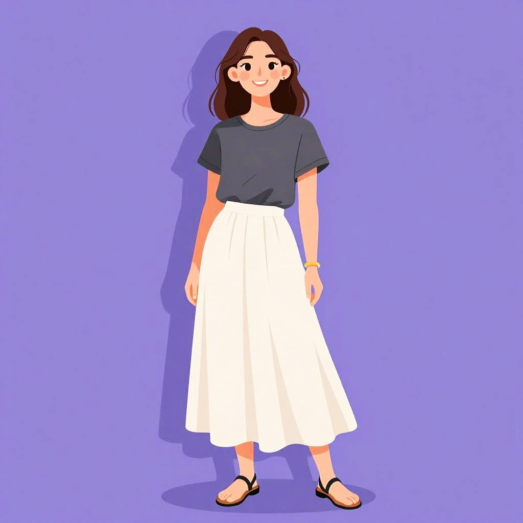 Woman with pretty face and pretty hair. smiling Woman, contemporary bohemian, loose-fitted charcoal grey T-shirt with short sleeves, paired with an ivory maxi skirt that is flowing and has a gathered waist, minimalist flat strappy sandals in black, simple gold bangle on the wrist, plain background with a slight shadow. --sref 1467