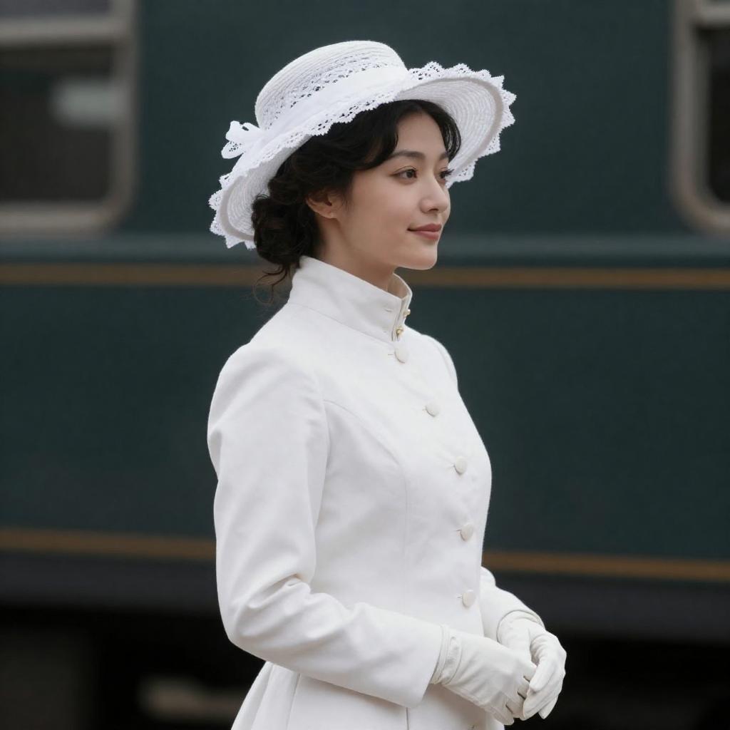 Photograph of a woman in a white lace dress and wide-brimmed hat with a blue ribbon, sitting on a wooden chair, smiling and laughing. She wears white gloves and sits in front of a white house with columns. Two other women in similar white dresses and hats sit in the background, blurred. Bright daylight illuminates the scene.