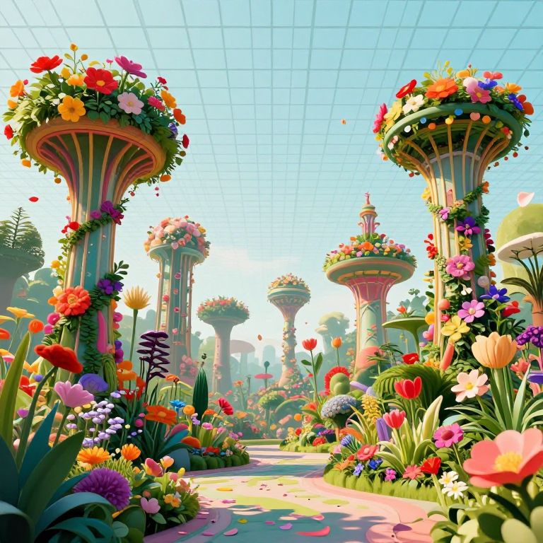 A vibrant, futuristic garden with towering structures adorned with flowers, set against a backdrop of a grid-like pattern and floating petals, reminiscent of the art styles of John Berkey and Jacek Yerka.