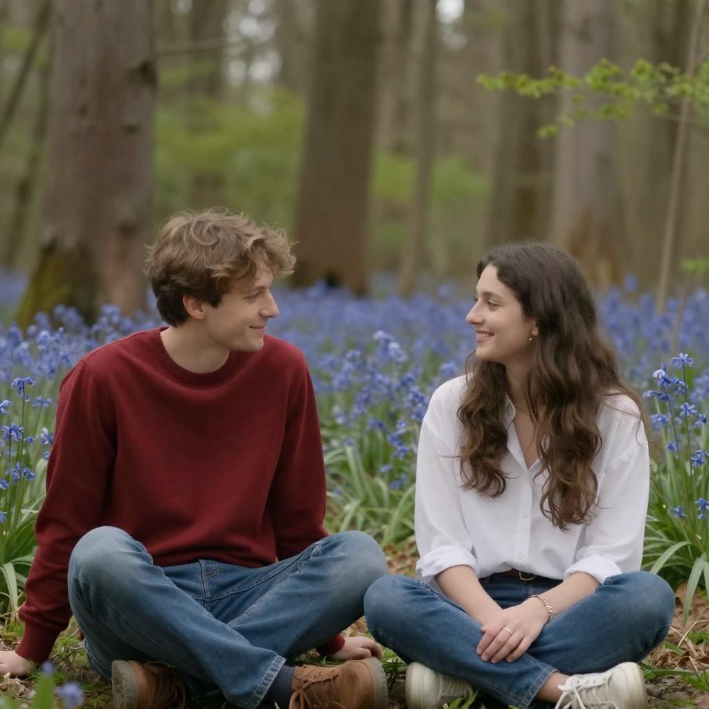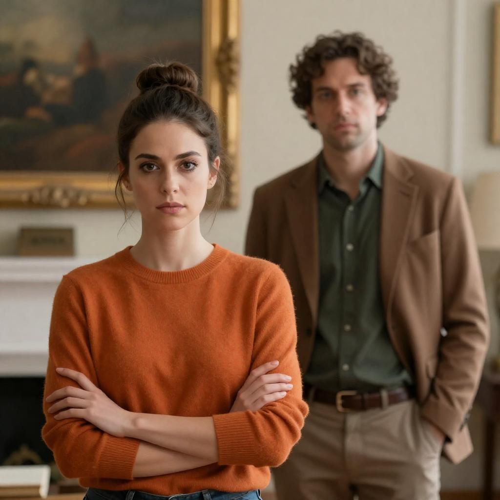 Photograph of a museum exhibit. Two people walk side by side. Woman in orange sweater, red skirt, white sneakers, dark hair in bun. Man in brown blazer, dark shirt, jeans, curly hair. Large stone statues of seated figures surround them. Soft lighting, pale green walls, small window at top. Woman and man looking at each other, slightly smiling. Statues on left, right, and background. Woman on left, man on right.