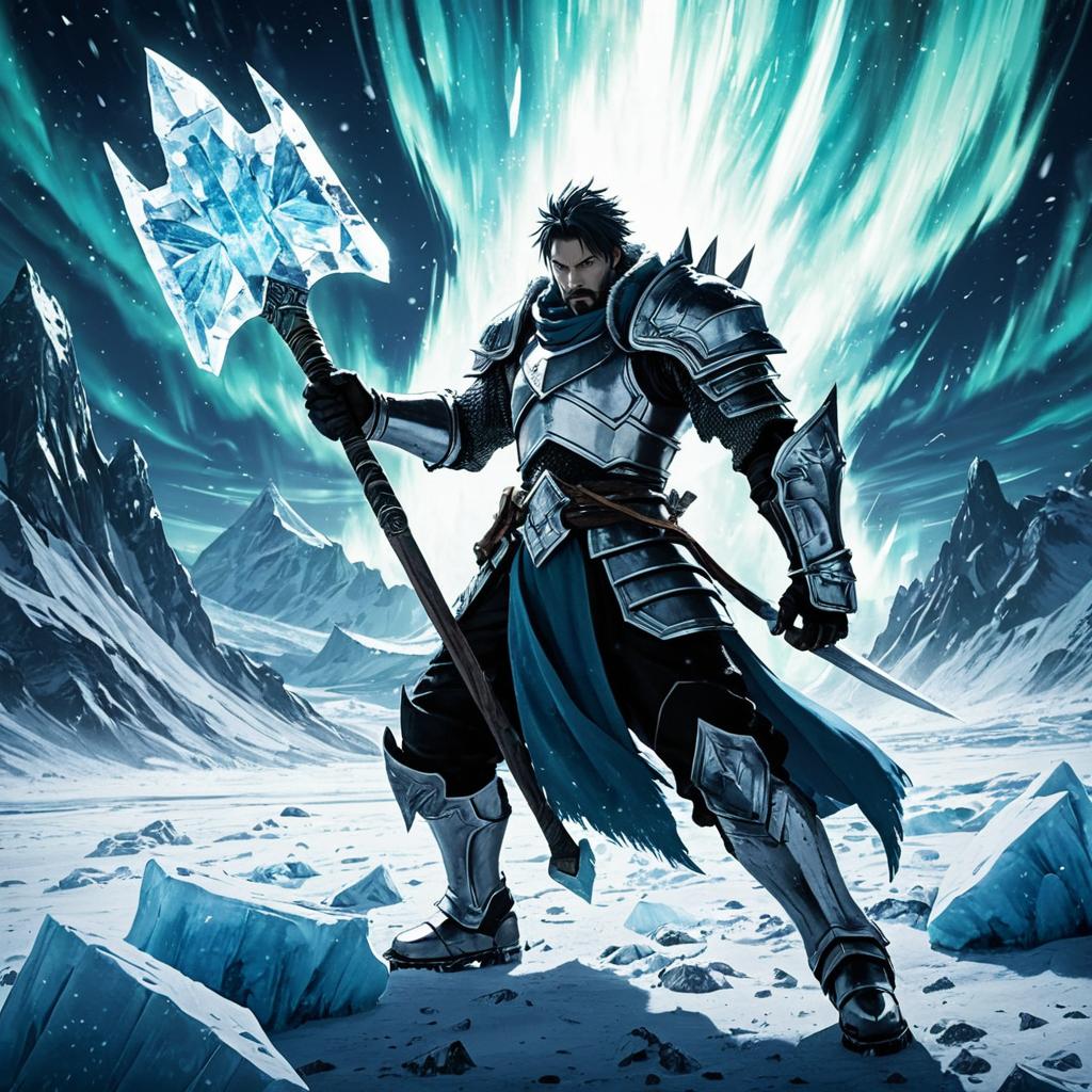 Anime-style illustration of a stoic glacier knight clad in dark armor with silver plating, wielding a massive crystalline ice hammer, standing in a frozen tundra surrounded by jagged ice formations and mountains. The background features vibrant auroras illuminating the icy landscape, evoking a surreal and intense atmosphere.