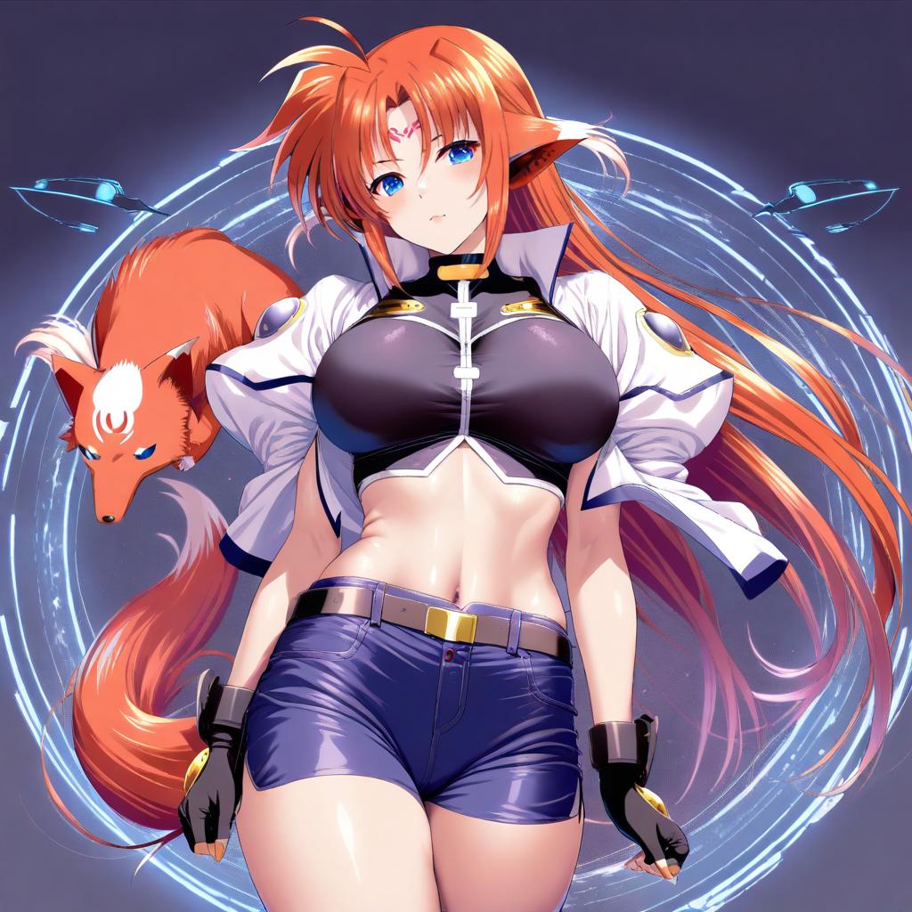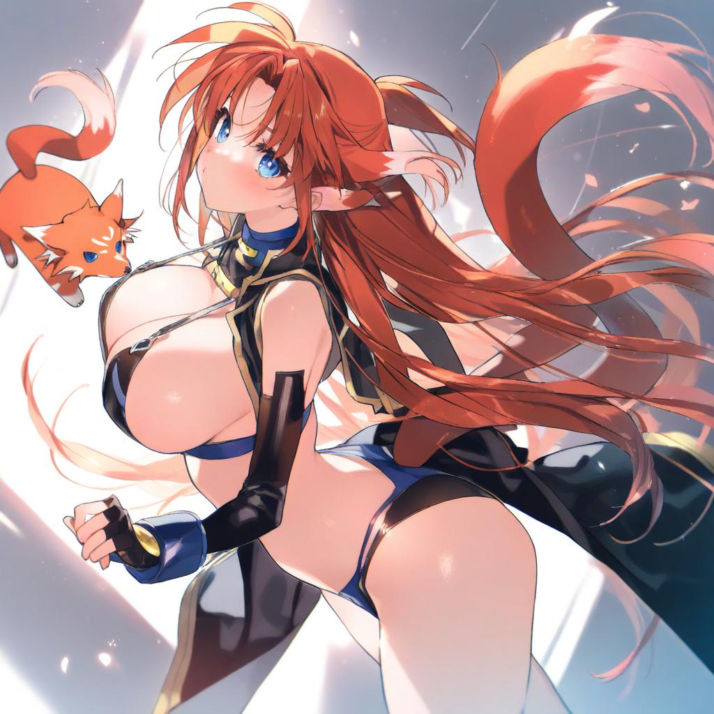Arf, lyrical nanoha, 1girl, tail, blue eyes, long hair, red hair, large breasts, by artist tetsu (kimuchi), illustrious