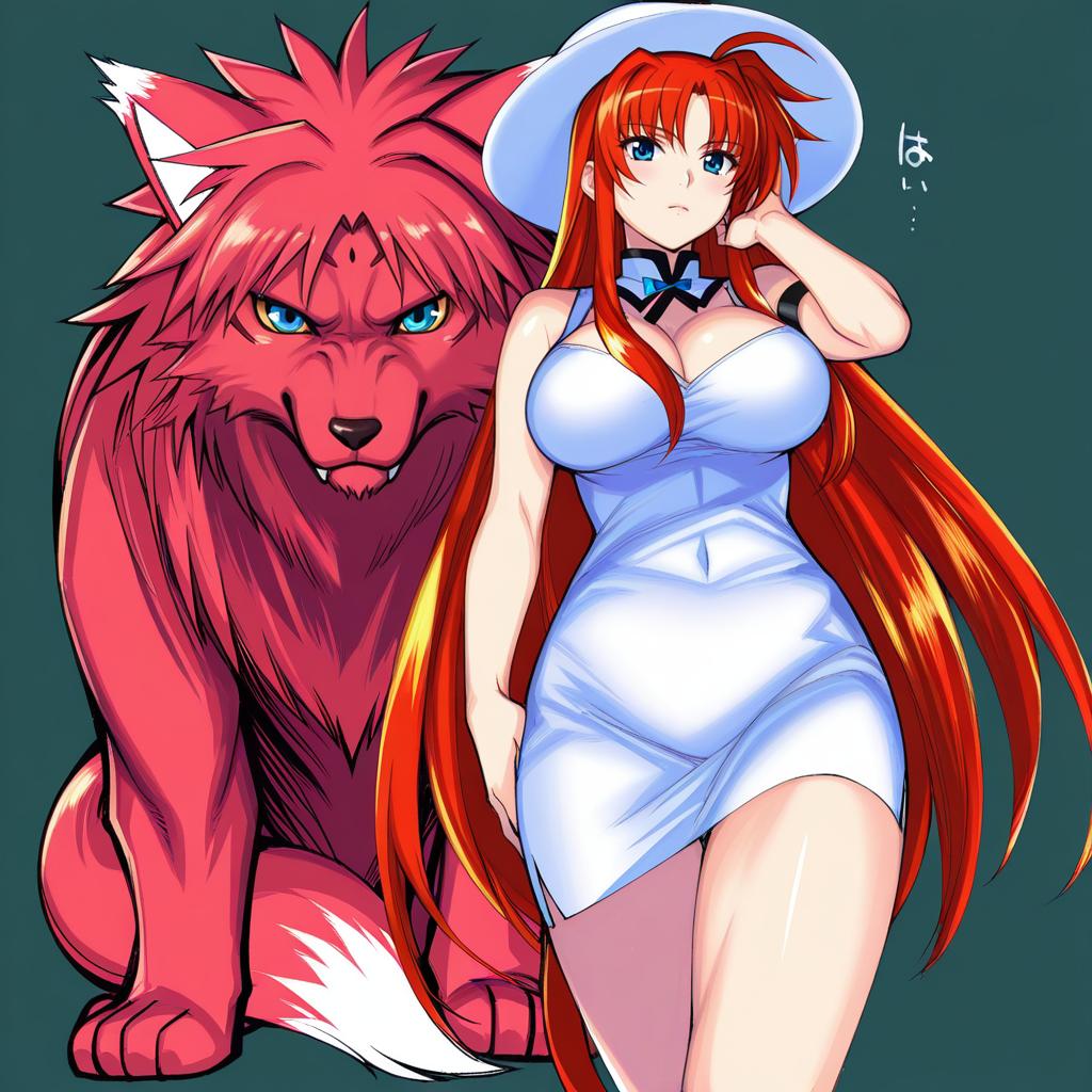 Digital illustration of an anime-style girl with long red hair and blue eyes wearing a tight white dress and a white hat, standing confidently next to a large red wolf-like creature with blue eyes and a bushy tail. The artwork features bright, saturated colors and detailed shading on the characters, showcasing an intense and powerful visual style.