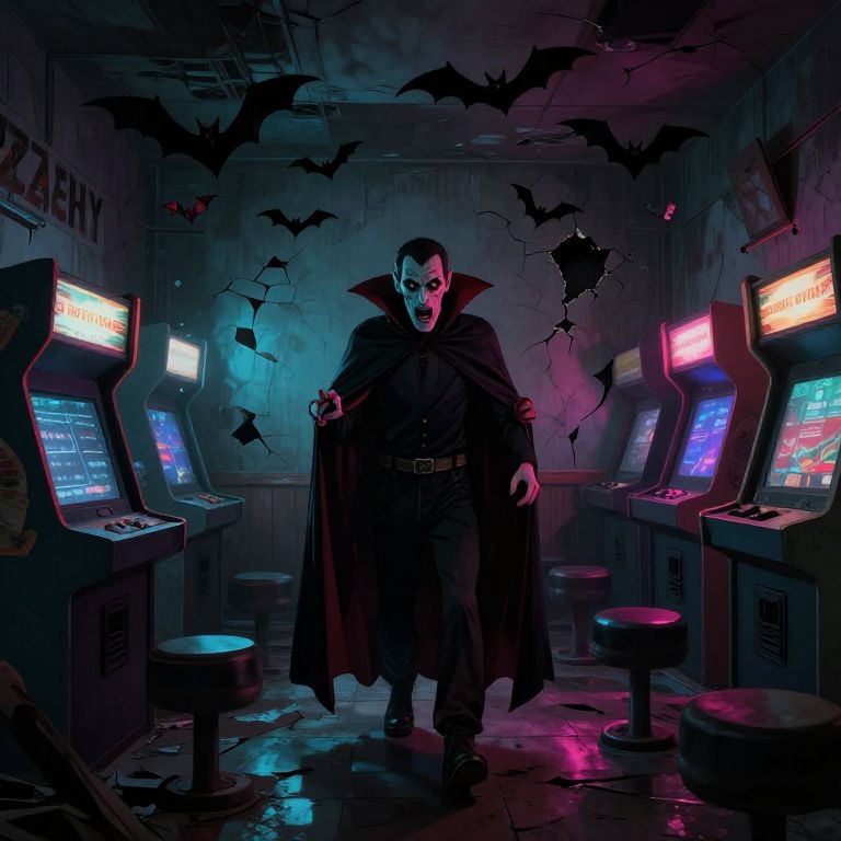 Digital artwork of a dark, eerie arcade room. A pale-skinned, male vampire with sharp fangs, black cloak, and red collar stands menacingly at the center, pointing forward. His eyes are glowing white. The room is dimly lit with neon colors from four illuminated arcade machines on either side. Black bats are flying and silhouetted on the cracked, graffiti-covered walls. The floor is reflective, showing the neon lights. The atmosphere is spooky, with a mix of dark blues and reds, enhancing the supernatural vibe.
