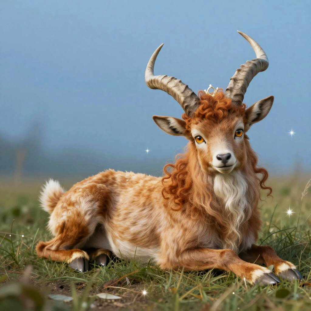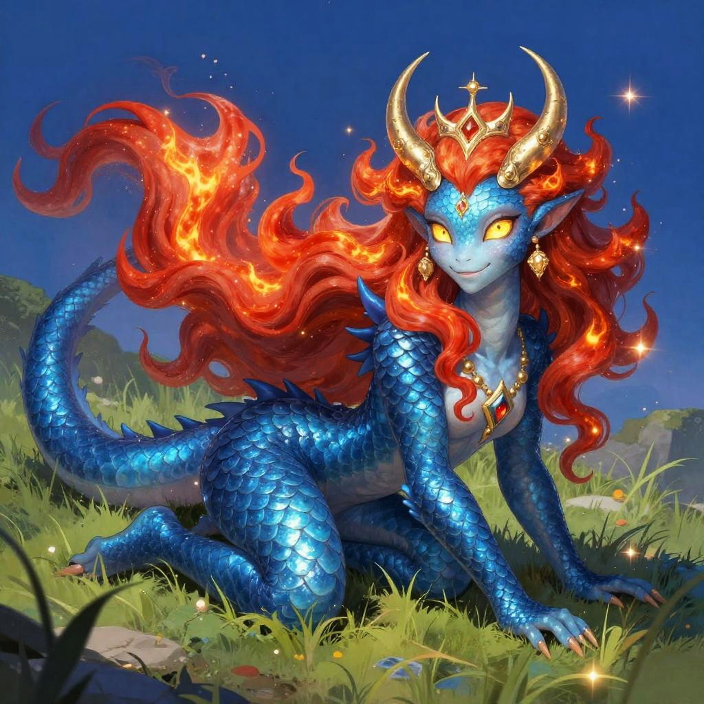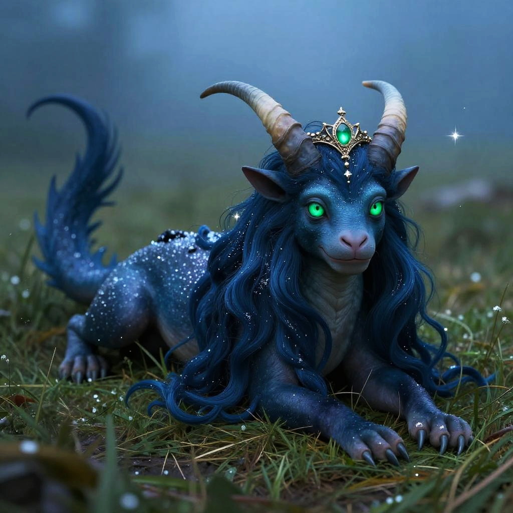 Full body, solo, dryad, verdant dryad with vibrant leaf-green hair, moss-flecked skin, and luminous golden eyes like dappled sunlight, single horn, tiara, crescent, lying on grass, looking at viewer, closed mouth, smile, sparkle, whimsical, fantasy, ethereal, magical, enchanting, blue background