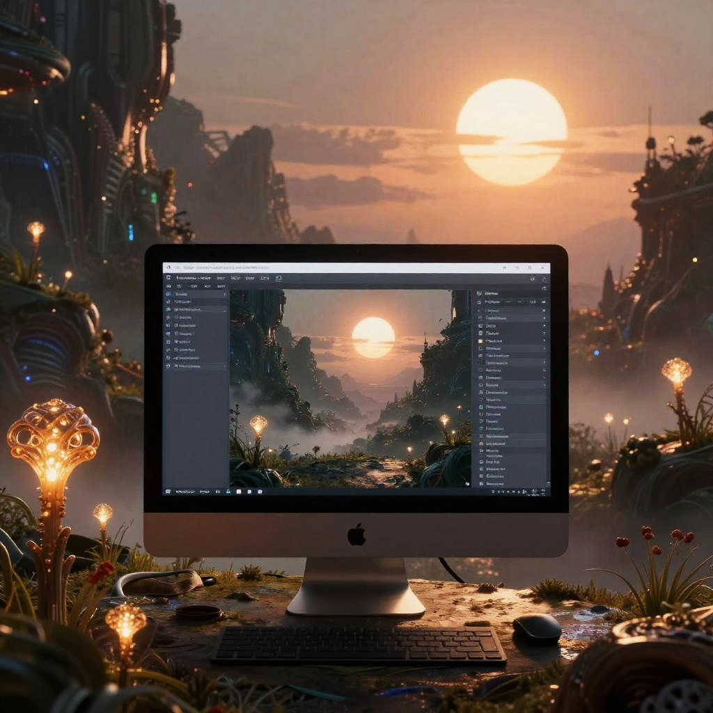 AI art creator free software crafting imaginative sci-fi landscapes, glowing alien flora, intricate details, hyper-realistic textures, vast otherworldly horizons under twin suns, cinematic lighting with mist and shadow contrasts