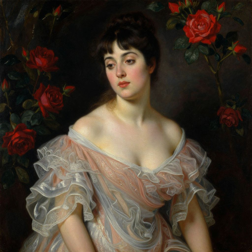 A Spanish-born British Romantic Realist painter, Goyo Dominguez, captures the essence of 1960s elegance in this oil painting, featuring a woman in a delicate off-the-shoulder gown with ruffled details, set against a dark backdrop adorned with vibrant red roses, illuminated by dramatic lighting that highlights her serene expression and the soft textures of her attire.