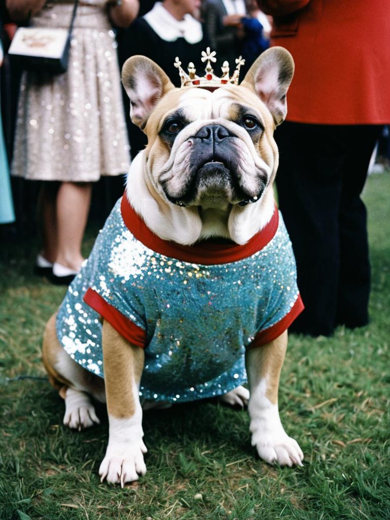 Bulldog in Queen Sparkles Dress, humorous costume festival photo