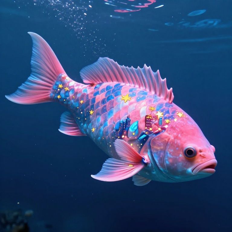 Enormous, slumbering space-fish with vibrant pink and blue scales drifts gracefully through a cosmic ocean, its body adorned with golden star-like patterns that reveal miniature cities nestled within its digestive tract, emitting ethereal light as it dreams.