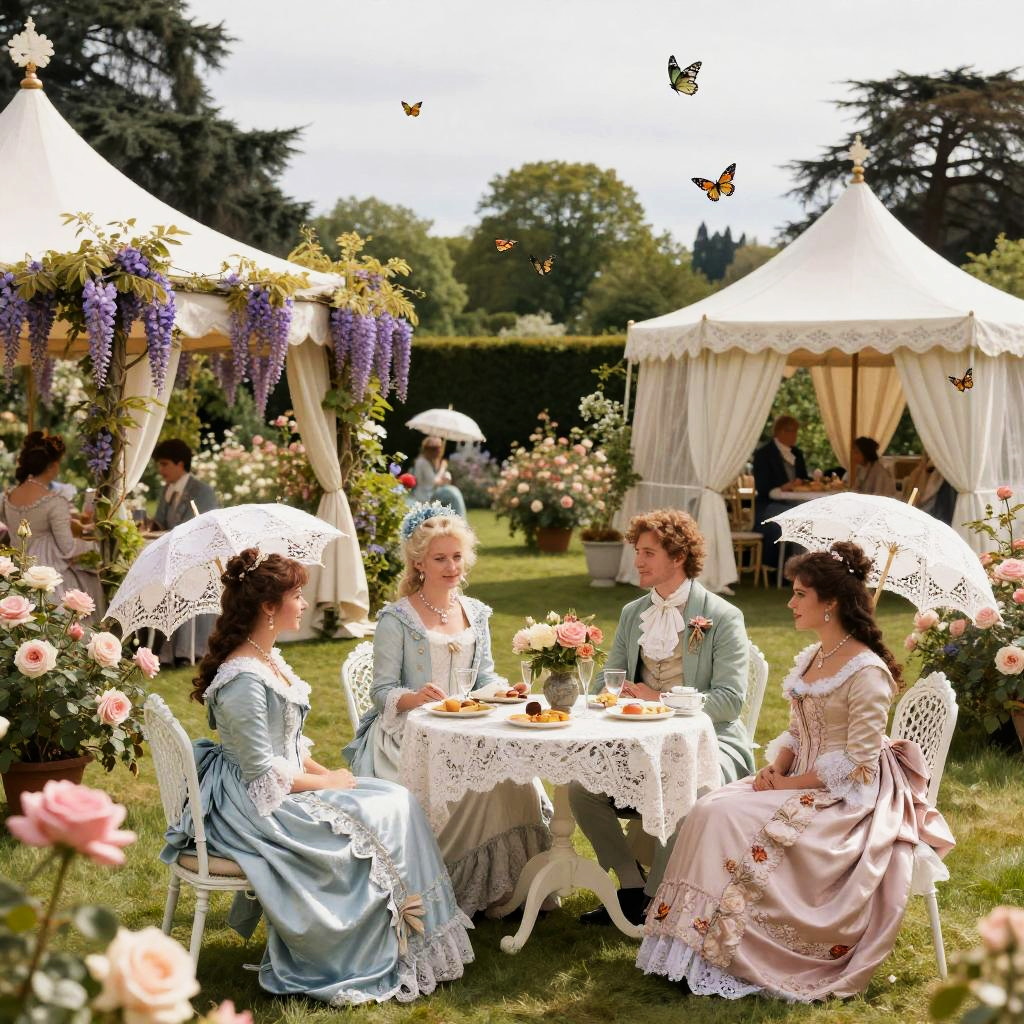 Viktorianisches garden party at a stately manor, blooming roses and wisteria, guests in period attire with lace and silk, white tents and lace umbrellas, afternoon light with gentle sun rays, birds and butterflies fluttering, romantic and refined scene