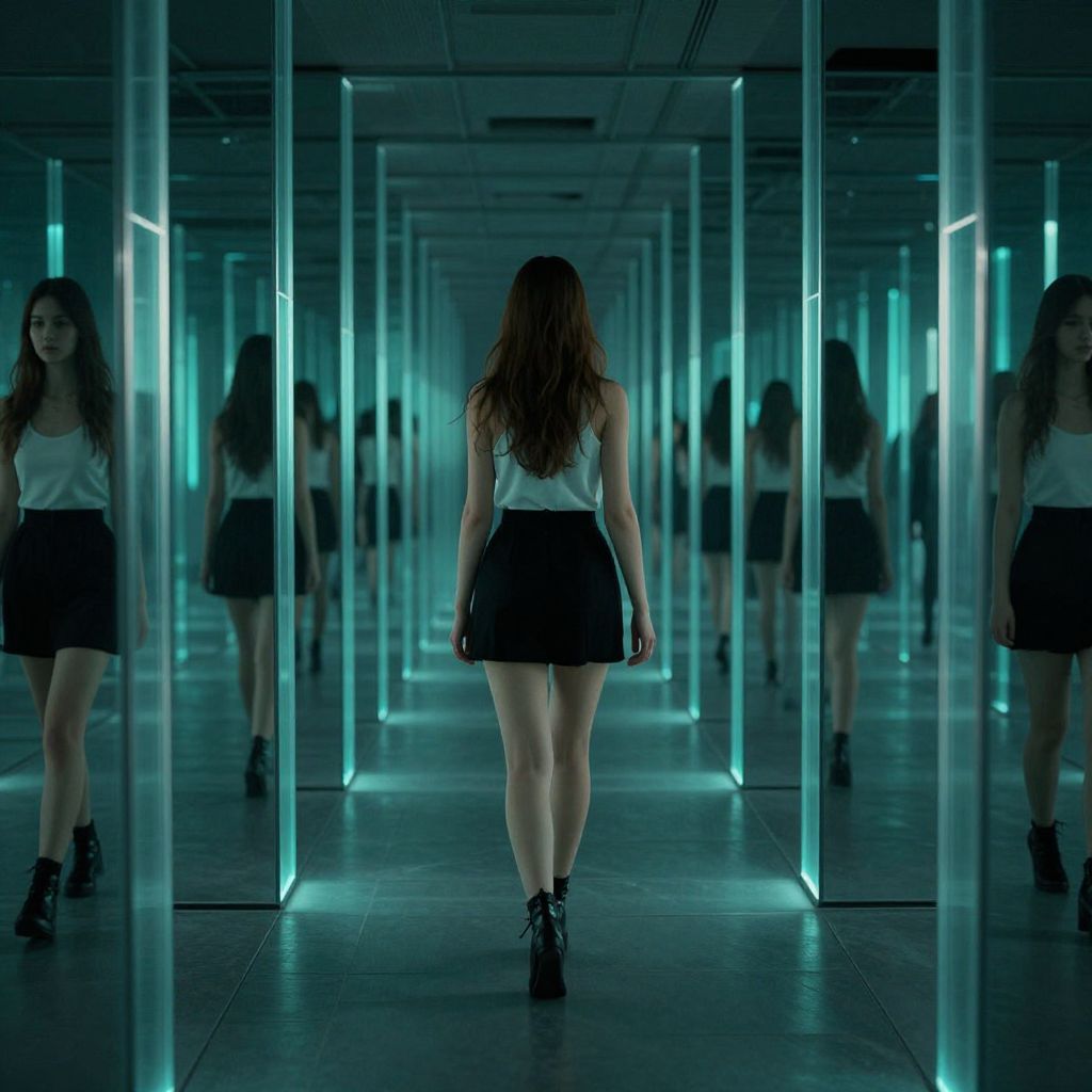 A surreal digital artwork depicts a woman walking down an endless corridor flanked by mirrored pillars, creating an illusion of infinite reflections that evoke a sense of introspection and memory, rendered in a high-definition, cyberpunk-inspired aesthetic with dramatic lighting and a cool teal color palette.