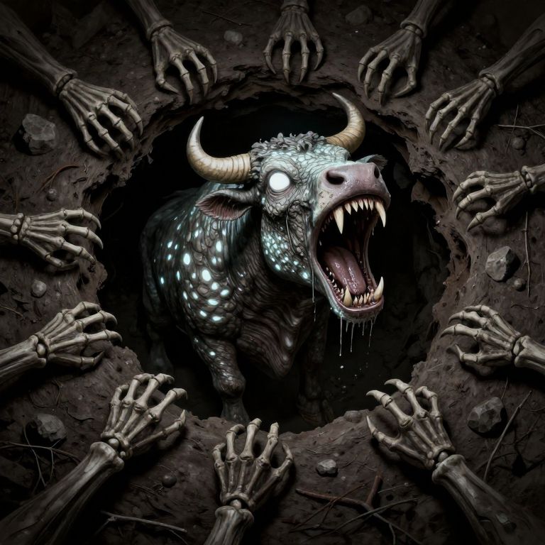 A dark, digital illustration depicts a monstrous, glowing-blue bull with sharp horns and glowing white eyes, roaring with its mouth open, revealing sharp teeth. The bull's fur is dark with glowing spots. It emerges from a circular, black, dirt-covered hole, surrounded by multiple skeletal hands reaching towards it from the ground. The background is dark and gritty, emphasizing the eerie, supernatural atmosphere. The bull's texture is rough and detailed, contrasting with the smooth, skeletal hands. The scene is intense and terrifying, with a horror fantasy style.