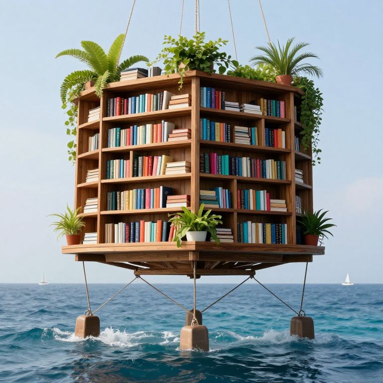 Suspended above the ocean, a multi-tiered wooden library floats gracefully, its shelves brimming with colorful books and adorned with lush green plants, while being tethered securely by a network of ropes connected to weighted boxes below, creating a surreal blend of knowledge and nature against a backdrop of rolling waves and distant sailboats.