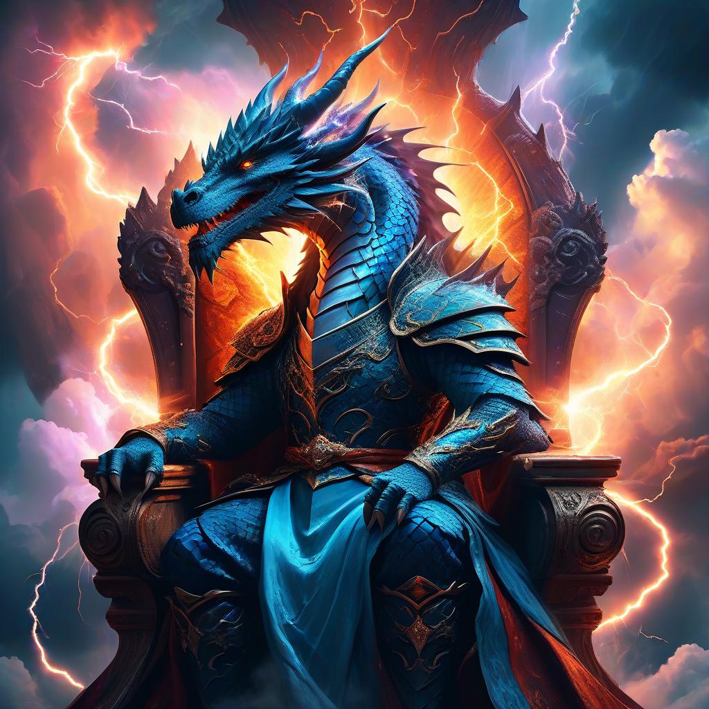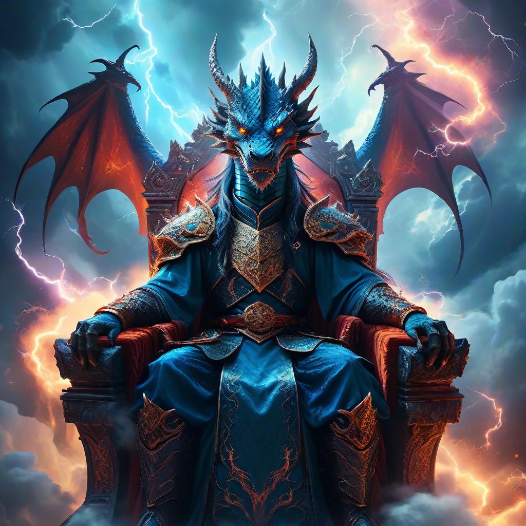 Fantasy portrait of a majestic dragon lord sitting on a throne, surrounded by crackling lightning, swirling clouds, digital painting style, vibrant colors, ethereal and mystical atmosphere, intricate designs, radiant lighting, divine presence