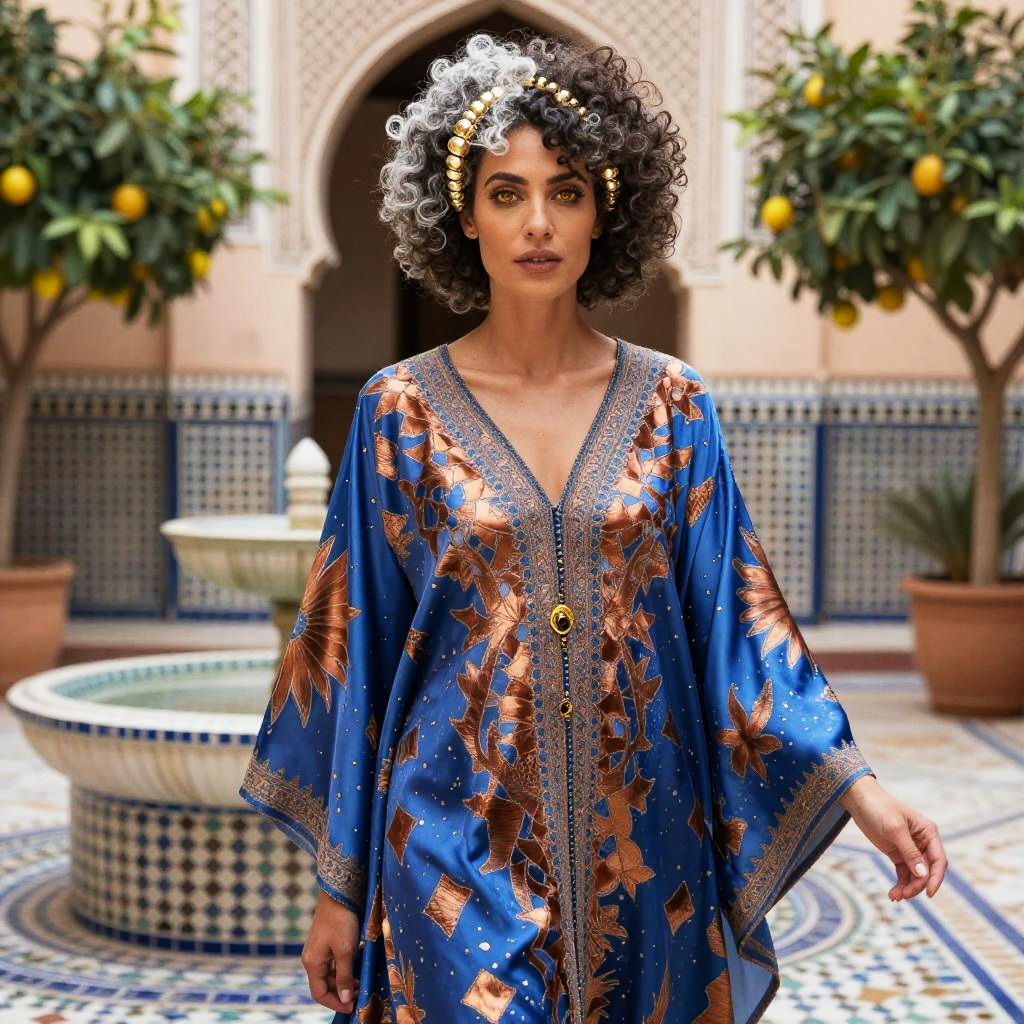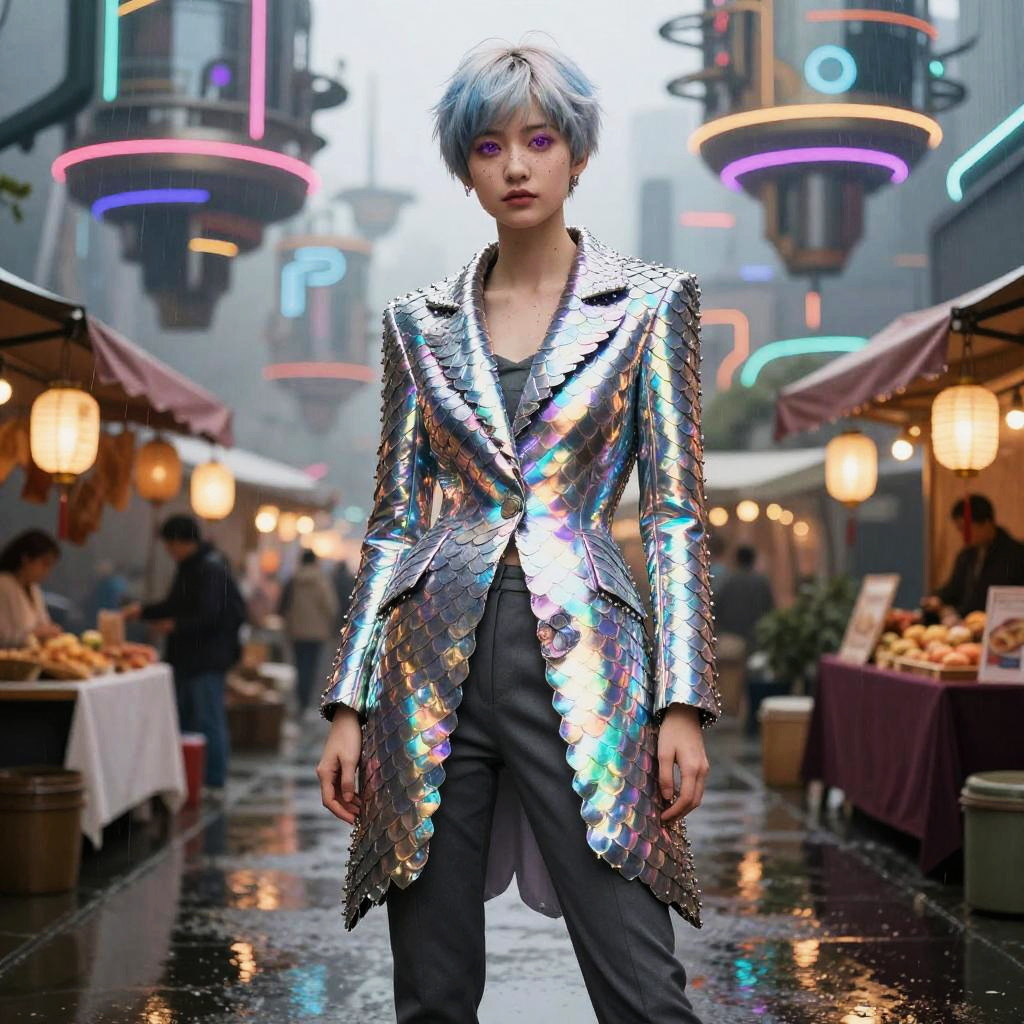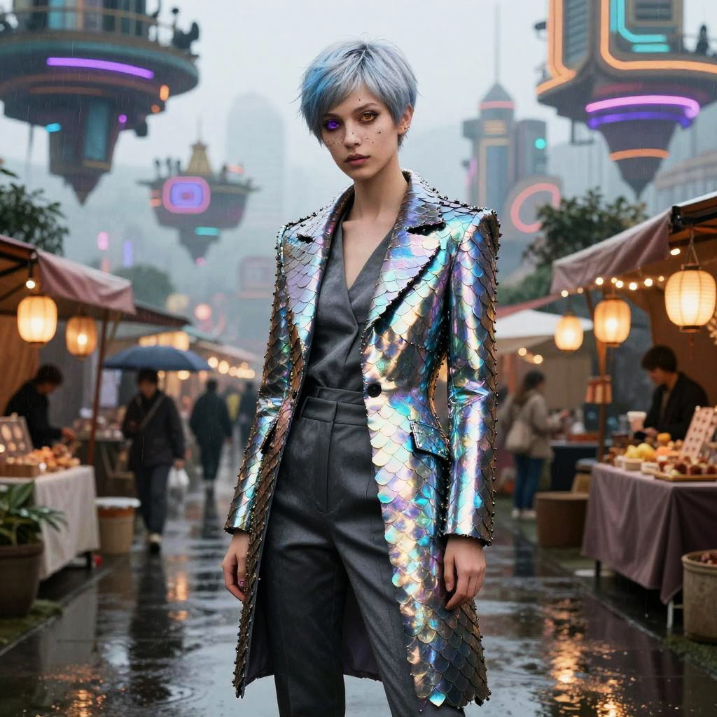 Androgynous youth with a silver-blue pixie cut and faint constellation freckles wearing a high-fashion asymmetrical iridescent coat with metallic scale-like panels over tailored charcoal trousers. She has heterochromatic eyes (left violet, right amber) and is positioned against a backdrop of ornate futuristic neon-lit floating market above a rain-slick canal with lanterns and hovering stalls, exuding an air of elegance.