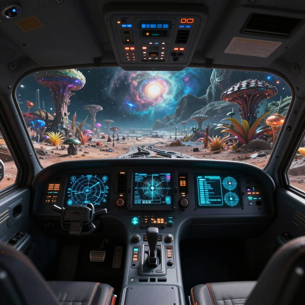 Rearview perspective inside a spacecraft cockpit overlooking a vast alien landscape, glowing nebulae and strange plants outside, futuristic control panels with holographic displays, dramatic lighting with sharp contrasts, sci-fi concept art style.