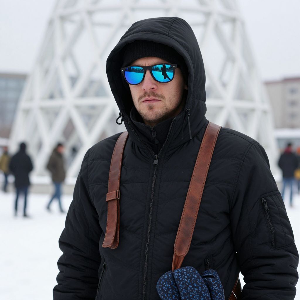 Photograph of a rugged man standing outdoors in a snowy, urban setting. He's wearing a black, quilted hooded jacket with a zipper, brown leather straps across his chest, and blue reflective sunglasses. His gloves have a blue pattern. The background shows a large, geometric, white structure with blurred figures. He looks serious and determined, with his hood up and face partially shadowed.