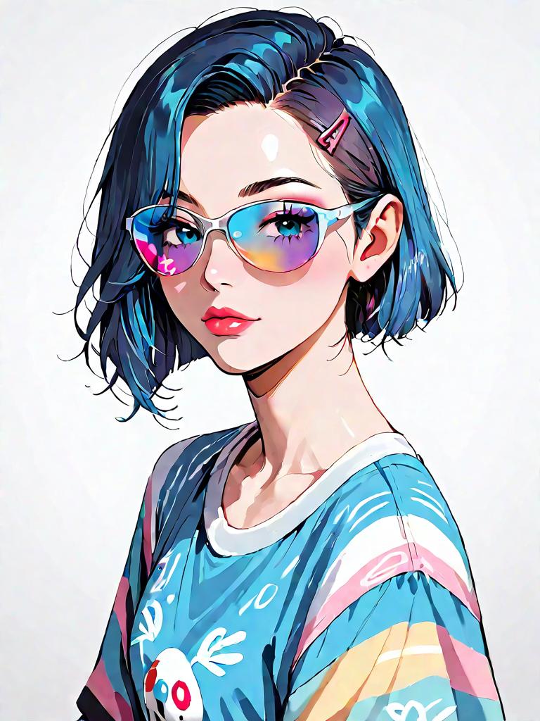 Illustration of a young woman with short dark blue hair wearing oversized retro-style sunglasses. She is dressed in a colorful, casual striped top with a fitted bodice and asymmetrical hemline, featuring soft and lightweight fabric details. The artwork captures a chic and playful fashion vibe with intricate beadwork and layered ruffles elements.