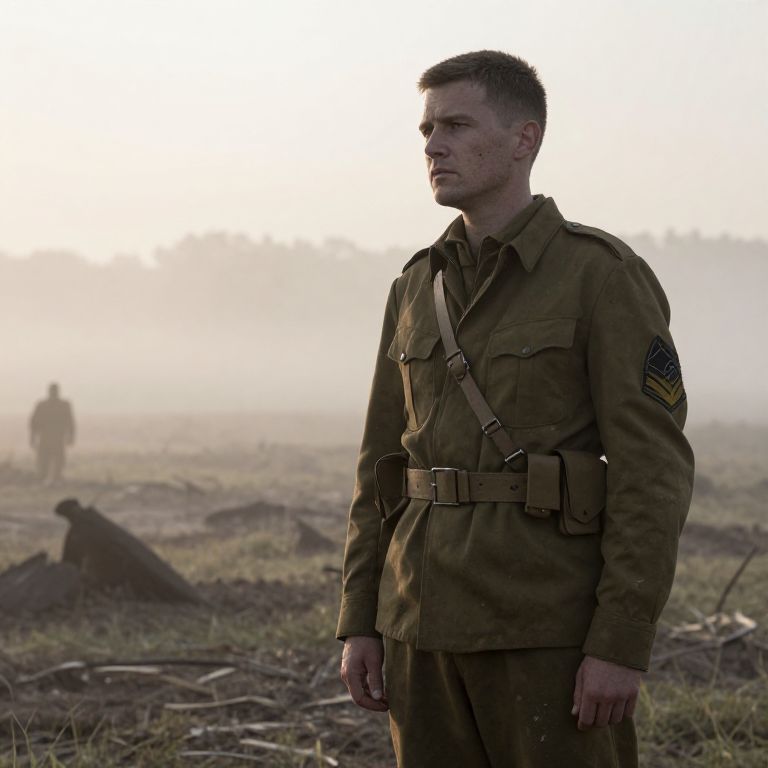 Former soldier standing alone on a battlefield at dawn, wearing worn military uniform, with a pensive expression, soft rays of sunlight breaking through mist, highlighting a sense of reflection and sacrifice, detailed, cinematic lighting
