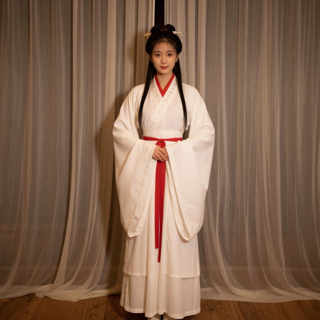 Photograph of an Asian woman with long black hair in a traditional white Korean hanbok with red trim, standing against a sheer curtain backdrop.