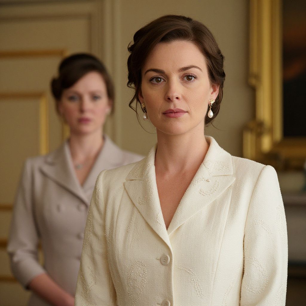 Elegantly styled woman in a cream blazer with intricate beadwork gazes intently forward, her poised demeanor accentuated by pearl earrings and a soft updo, while another figure stands blurred in the background within a warmly lit, vintage setting reminiscent of *Downton Abbey*.
