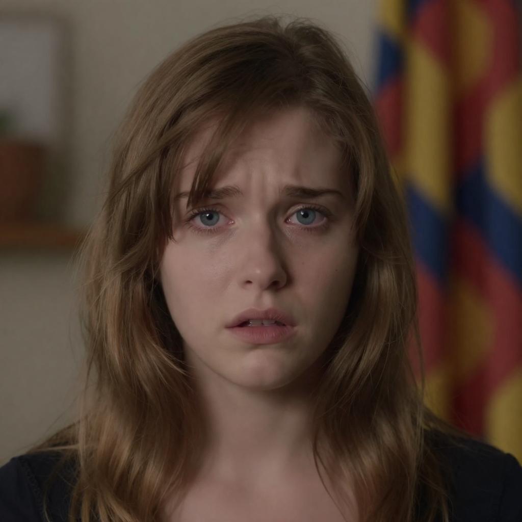 Close-up photograph of a young woman with light brown, slightly disheveled hair and bangs, pale skin, and blue eyes. She has a slightly open mouth and a worried expression. The background is blurry with colorful, patterned curtains on the right. She is wearing a dark top.
