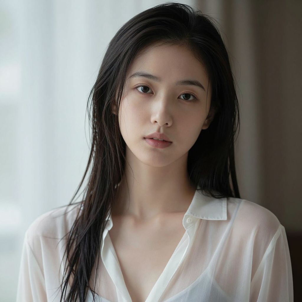 Photograph of a young East Asian woman with long black hair, fair skin, and neutral expression, wearing a sheer white button-up shirt, against a