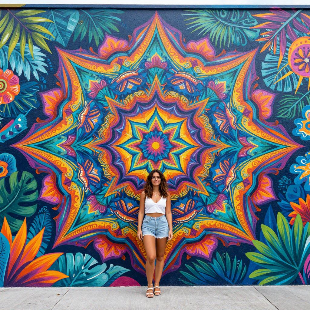 Photograph of a young woman with long brown hair, wearing a white crop top and light blue denim shorts, standing in front of a vibrant, psychedelic mural. The mural features a colorful, intricate mandala design with swirling patterns in bright oranges, blues, yellows, and greens, surrounded by large tropical leaves. The woman stands in the center, slightly to the left, with a confident pose, and the mural's vivid colors contrast with the clear blue sky and white pavement in the background. The mural's texture appears smooth, and the overall style is reminiscent of 1960s psychedelic art.