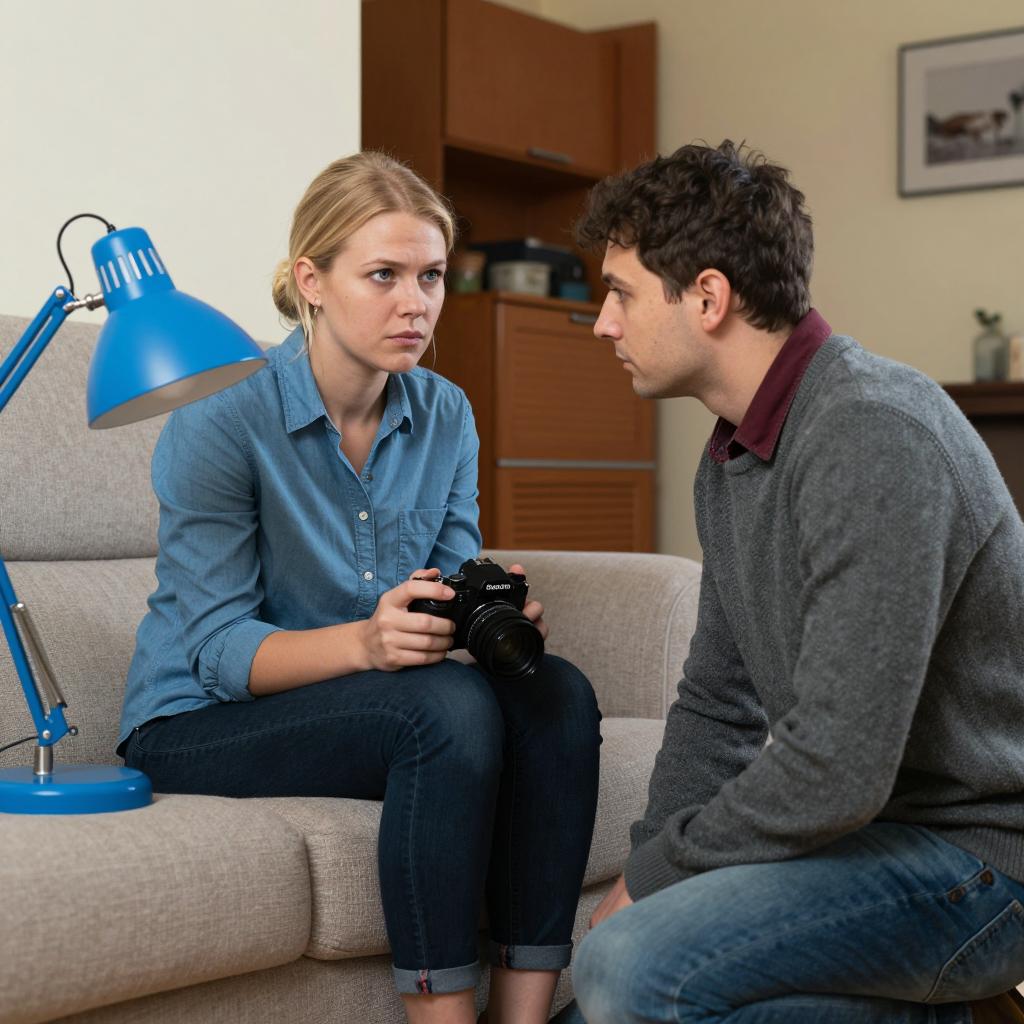 Two people sitting in a tiled bathroom. Woman with short red hair, black lace top, and blue shawl. Man with dark curly hair, green shirt, yellow goggles around neck. Woman's arm around man's shoulder. Man looking at woman, smiling. Background includes bathtub and toiletries.