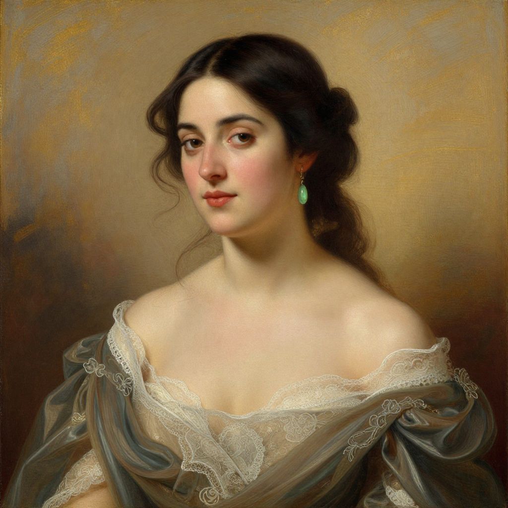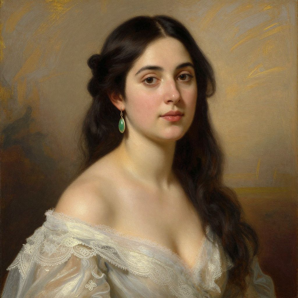 A digitally rendered portrait in the style of Spanish-born British Romantic Realist painter Goyo Dominguez, featuring a woman with elegant, flowing dark hair adorned with a delicate green pendant earring, dressed in a lace-trimmed off-the-shoulder gown against a textured background with warm, golden accents.