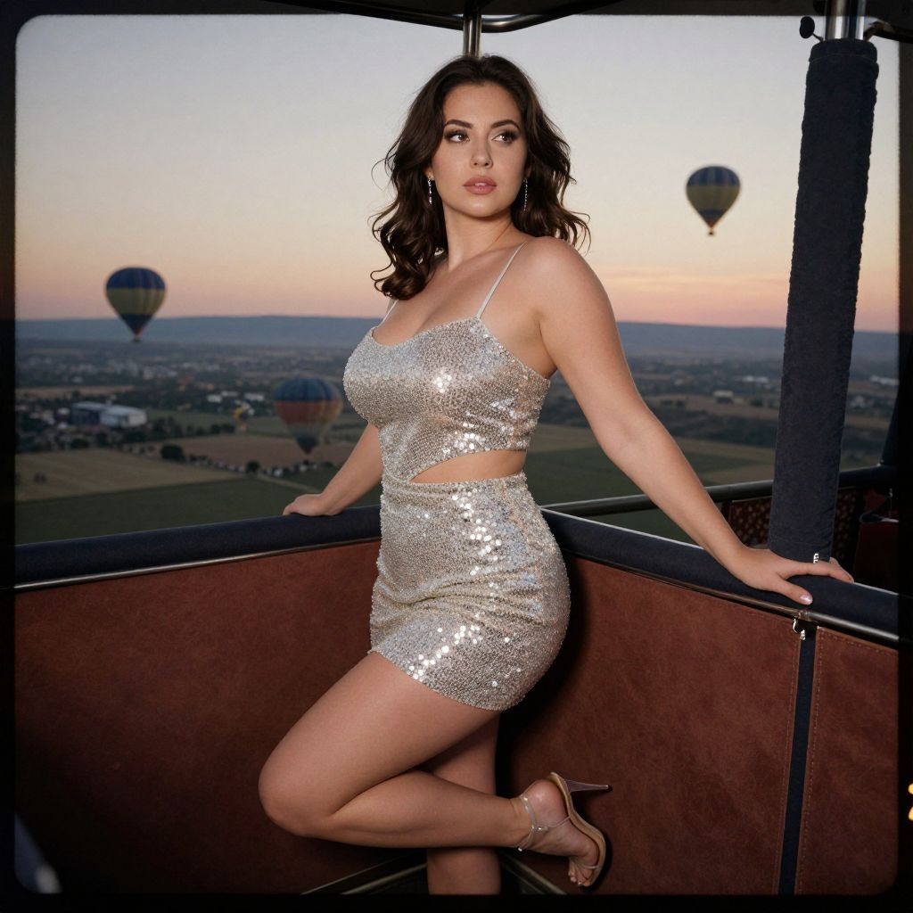 Photograph of a curvy woman with fair skin and wavy brown hair, wearing a shimmering, silver sequin, spaghetti-strap mini dress and matching high heels. She leans against a glass railing on an elevated viewpoint, with a sunset sky and two colorful hot air balloons in the background. The dress accentuates her hourglass figure and large breasts. The image has a soft, warm glow from the sunset, and the cityscape below is slightly blurred, emphasizing the subject. The railing has a dark, textured surface. The overall style is glamorous and glamorous.
