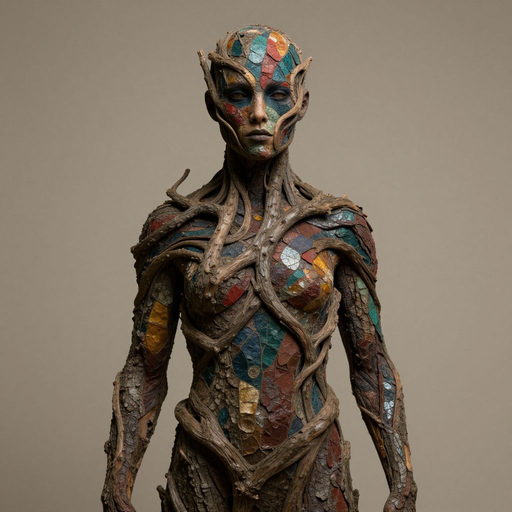 A photograph of a muscular, fair-skinned woman with an exposed, defined six-pack abdomen, standing against a dark, textured background. She is adorned with a colorful array of flowers, including yellow, orange, and purple blossoms, on her head, chest, and hips. Her face is serene, and her arms are relaxed by her sides. The flowers are arranged in a way that covers her nipples and pelvic area, contrasting with her bare, muscular torso. The overall composition is surreal, blending elements of natural beauty with human anatomy. The image has a dramatic, high-contrast style with vivid colors and sharp details.