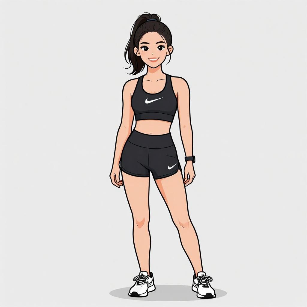Digital drawing of a smiling Asian woman with black hair in a ponytail, wearing a black sports bra and skirt, black sneakers, standing against a light
