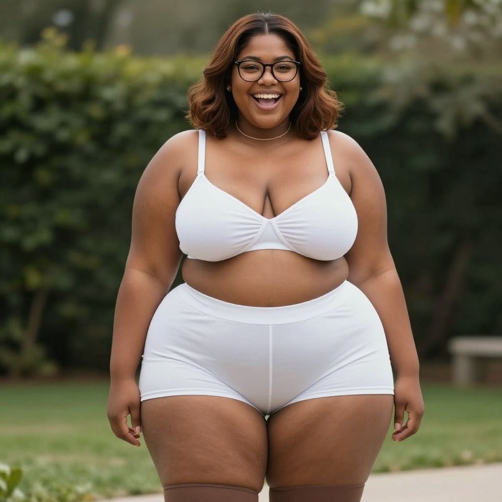Photograph of a smiling, curvy Black woman with shoulder-length brown hair, wearing white bra and shorts, large white glasses, outdoors.