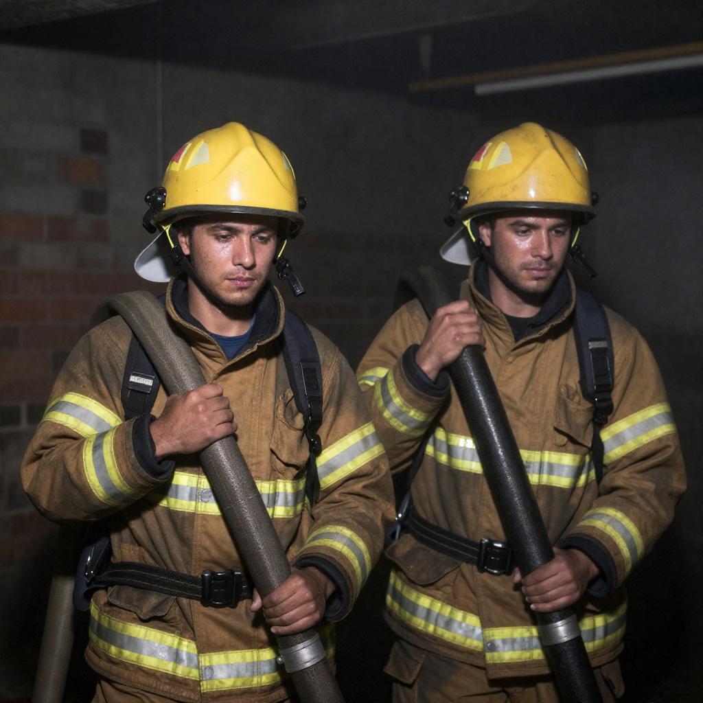 Photograph of two male firefighters in dark uniforms and yellow helmets, sitting on a wet, rain-soaked street. A red fire truck with flashing blue lights is parked behind them. Rain is visibly falling, creating a ured, reflective surface. The firefighters appear tired, with one leaning back and the other resting his head on the other's shoulder. The background includes a white building with greenery.