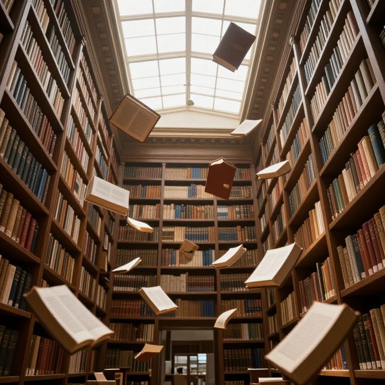 In a grand, sunlit library, books defy gravity, swirling and flipping mid-air as if responding to unseen currents of knowledge and curiosity.