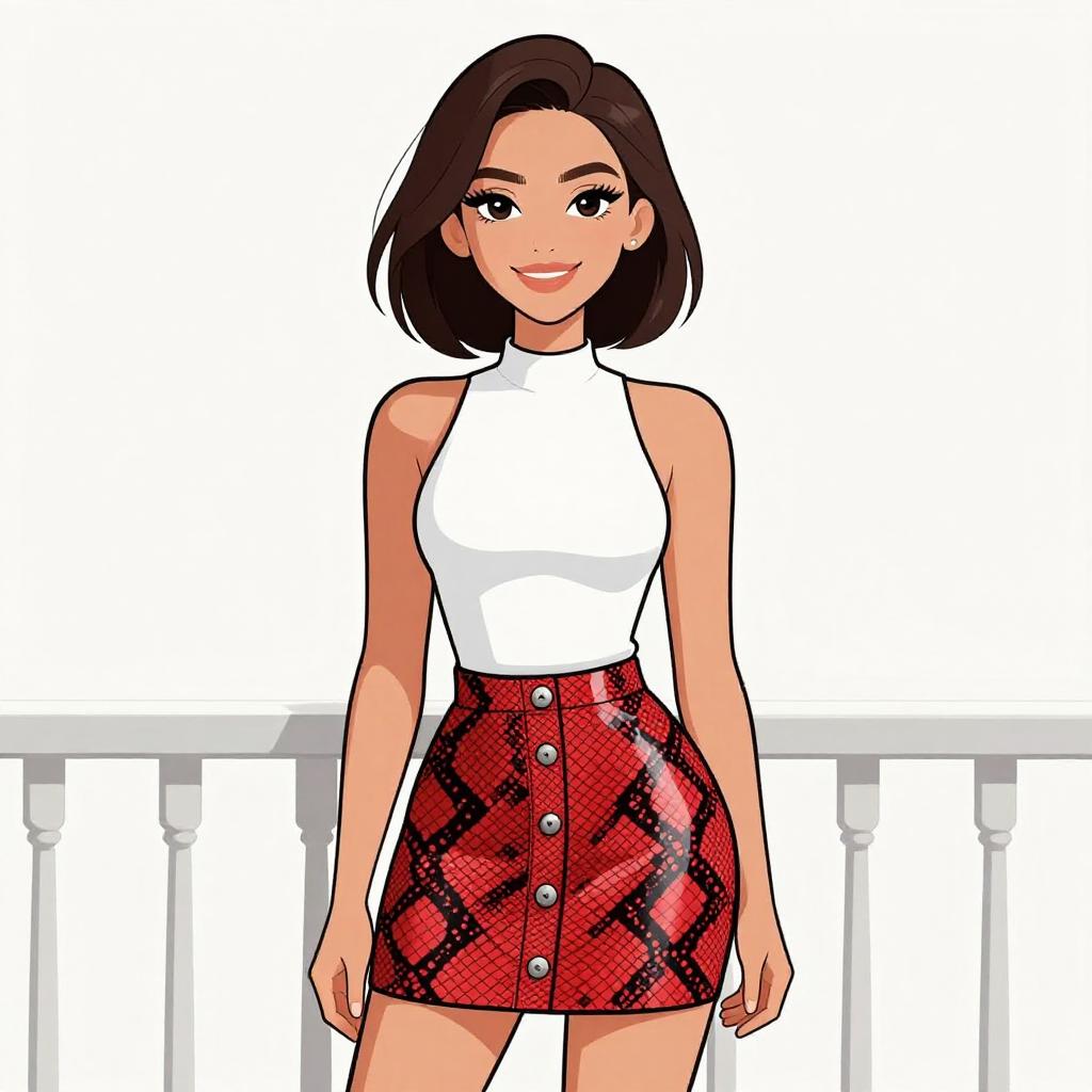 Woman with pretty face and pretty hair. smiling Woman, contemporary, white sleeveless halter top, tight fit, high neckline, red and black snakeskin patterned mini skirt, glossy finish, front snap button closure with silver-tone hardware, studio background with white railing and clean setting --sref 1467