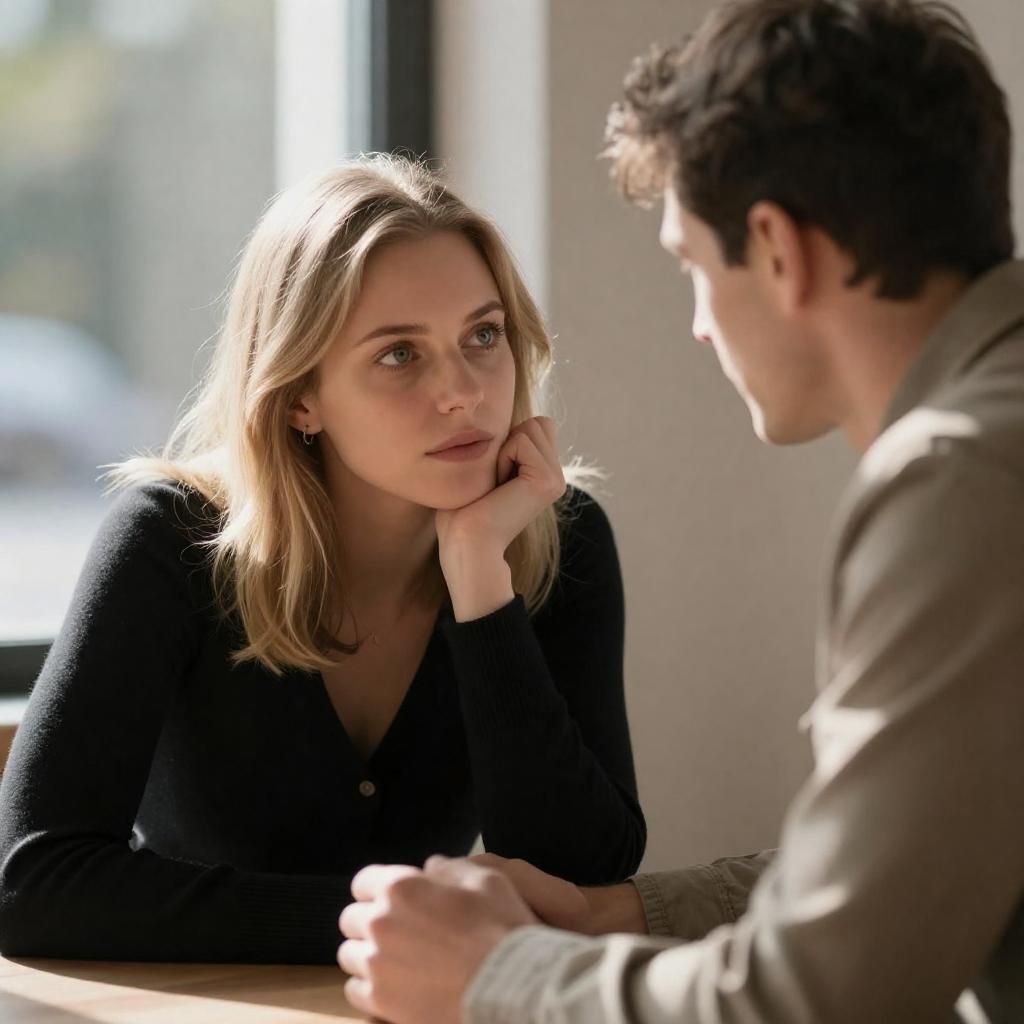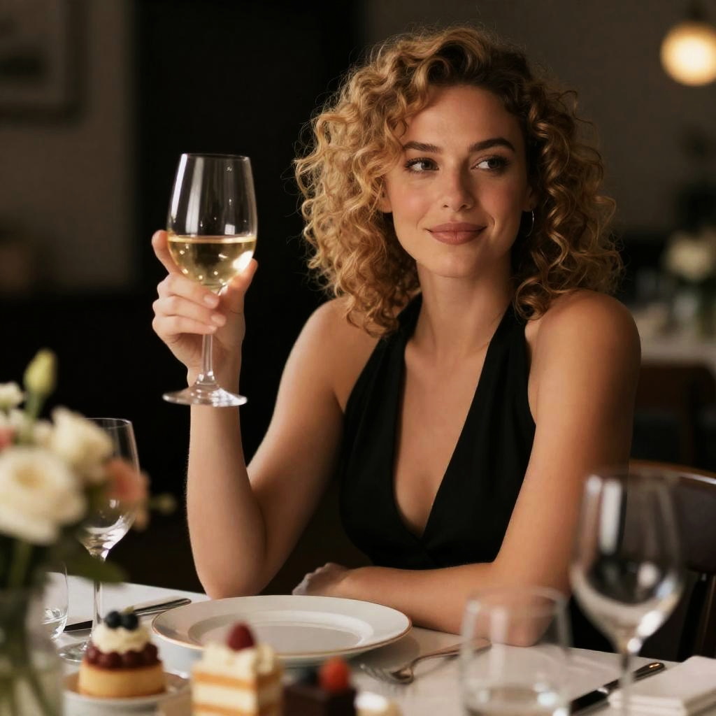 Photograph of a blonde woman with light skin and blue shirt, resting her chin on her hand at an outdoor café table. She's in the foreground, with an older man and a woman with dark hair in the background. The table has a wine bottle, glass, and plates. Green plant and wooden shelf are in the background.