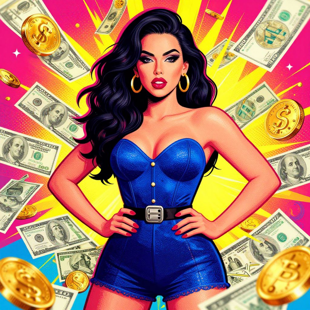 This vibrant, digital pop-art style illustration features a confident, curvaceous woman with long, wavy black hair and bold red lipstick. She wears a sparkly, blue, strapless romper with a black belt and large gold hoop earrings. Her hands rest on her hips. Behind her, a bright yellow and pink sunburst pattern radiates, surrounded by floating U.S. dollar bills and gold coins. The background's bold colors and comic-style elements enhance the image's dynamic, eye-catching quality. The woman's striking appearance and the money symbols suggest themes of wealth and empowerment.