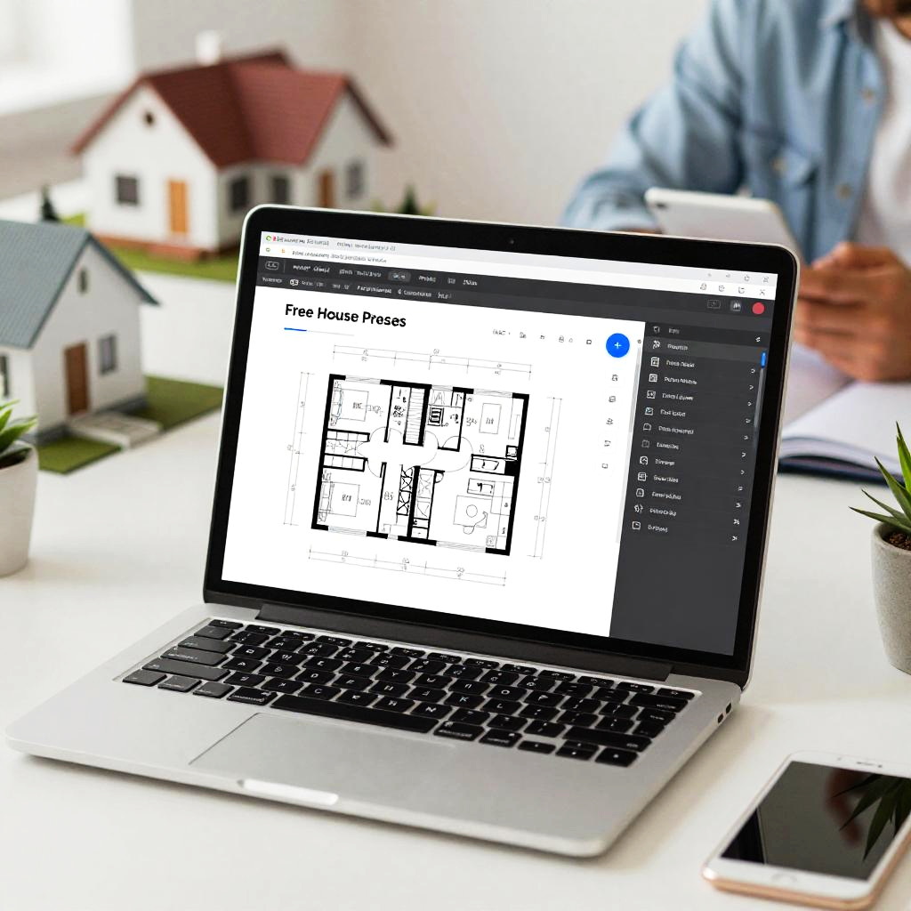 Free house blueprint maker interface, modern digital design software on a sleek laptop screen, vibrant user-friendly UI with floor plans, architectural tools, and editing options, bright workspace with designers collaborating, 3D house models in background