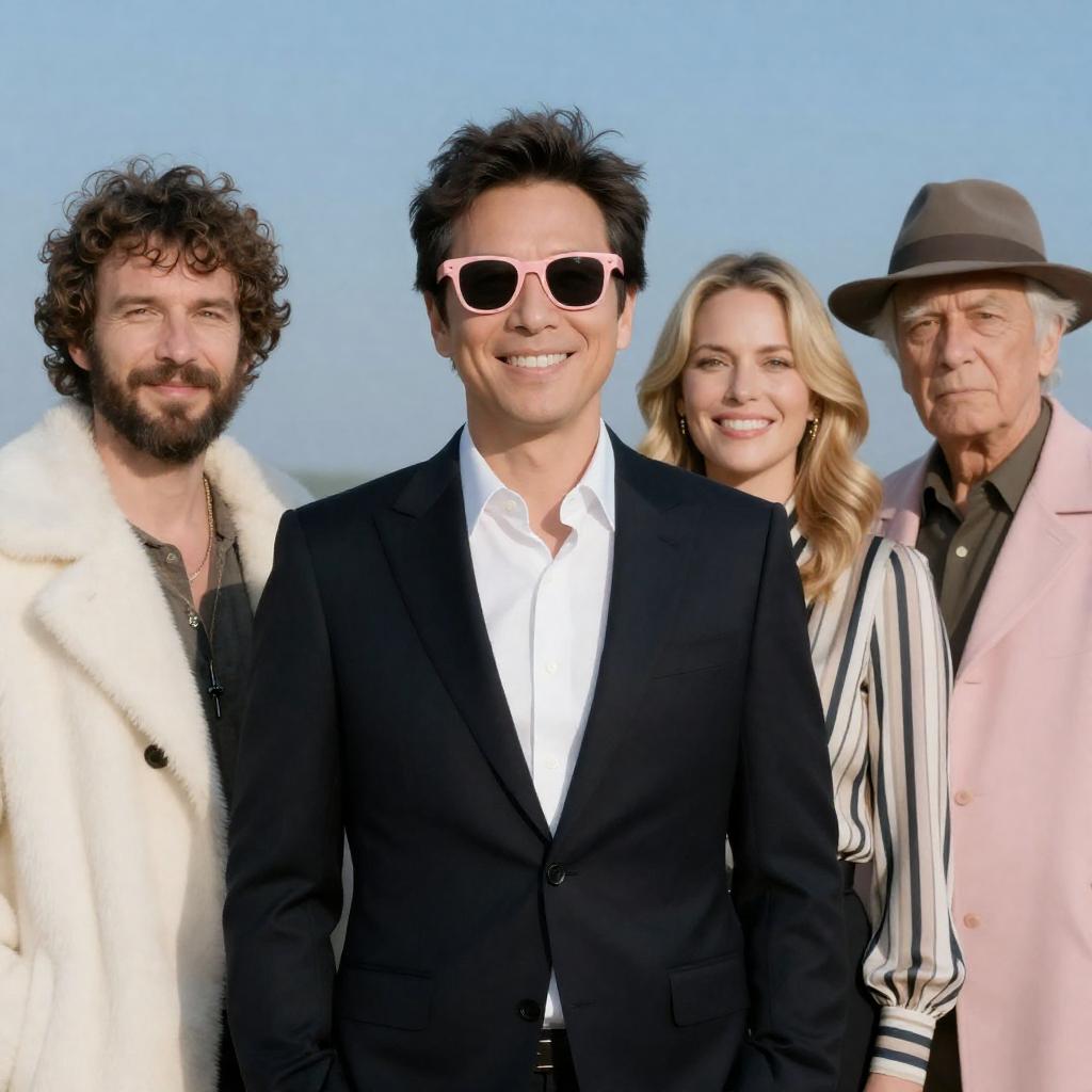Black and white photograph of four people. Male with dark hair in light vest and pants stands left. Blonde woman in white dress and white boots sits center. Young boy with dark hair in white shirt and dark pants sits right. Black drummer in light vest and hat sits far right. Drum set visible. All smiling.