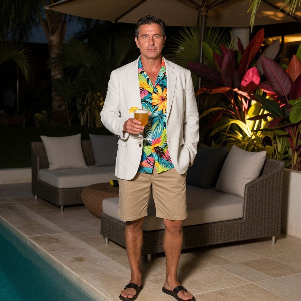 Photograph of a middle-aged man with short dark hair and a light beard, standing on a bamboo deck overlooking a tropical beach. He is wearing a cream-colored suit with a red polka-dot tie, white shirt, and tan dress shoes. The background features palm trees, lush greenery, and a clear blue sky with gentle waves crashing onto the sandy shore. The deck has a bamboo railing, and the man is smiling, looking directly at the camera. The overall scene exudes a relaxed, tropical vibe.
