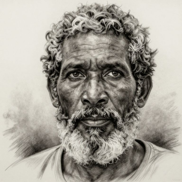 Create a hyper-realistic charcoal drawing that focuses on a close-up portrait of an experienced Caribbean fisherman. His wise and intense eyes reflect a life spent at sea, with lines around them and a leathered complexion suggesting years of navigating stormy waters. The man's rugged features are framed by a thick, tangled mass of salt-and-pepper hair, and his graying beard speaks to his endurance of harsh conditions. As he gazes off into the distance, lost in thought, capture the depth of his experiences and the stories etched onto his face. Subtle softness around his mouth hints at a warmth and humor that lies beneath his stoic exterior.