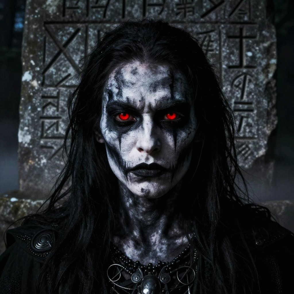Dark black metal face painted in bold monochrome corpse paint, piercing eyes glowing red, surrounded by ancient runes carved in stone, misty night forest setting, dramatic lighting emphasizing shadows and texture, atmospheric and intense digital artwork.