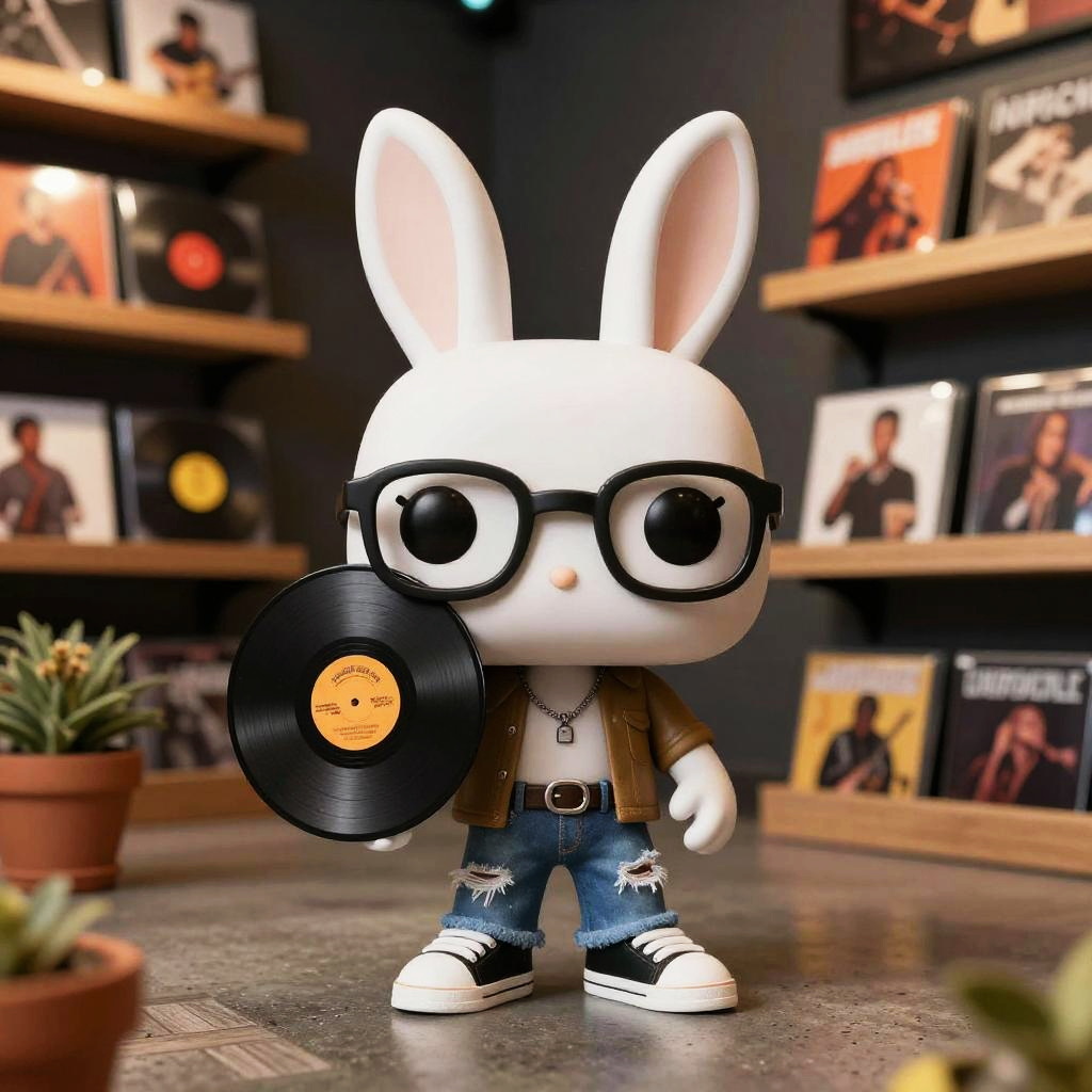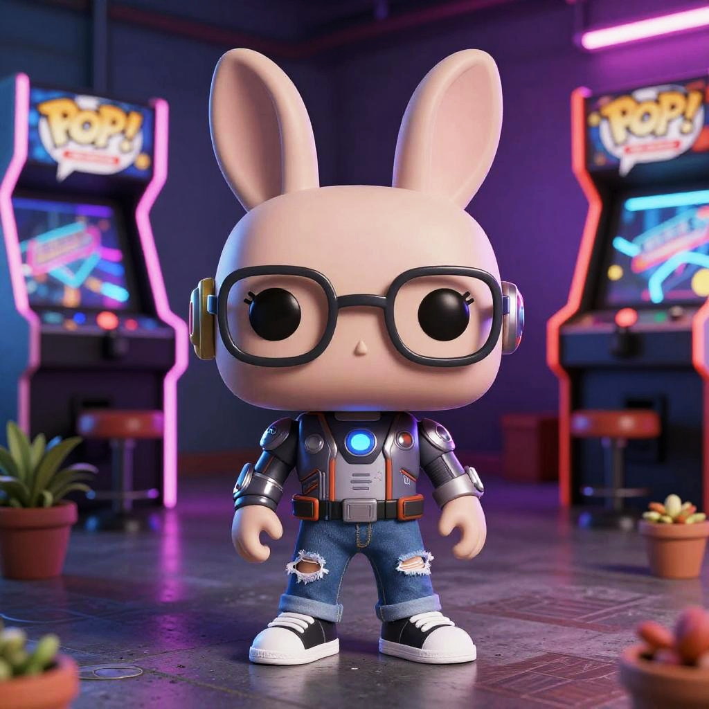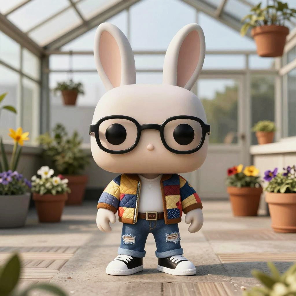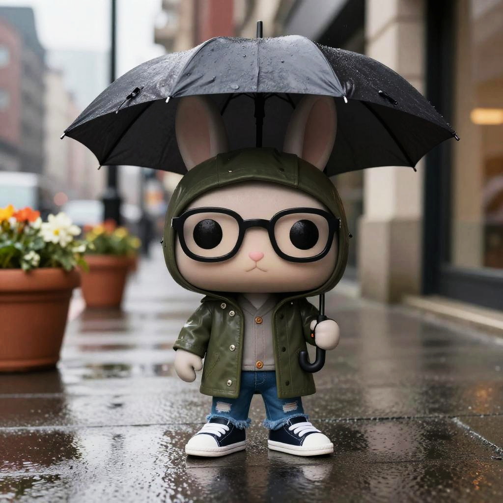 Funko Pop bunny dressed in a raincoat with an umbrella, with glasses, ripped jeans, sports shoes, in a rainy urban sidewalk, cinematic lighting, parquet concrete floors with flower pots, ultra-realistic editorial style.